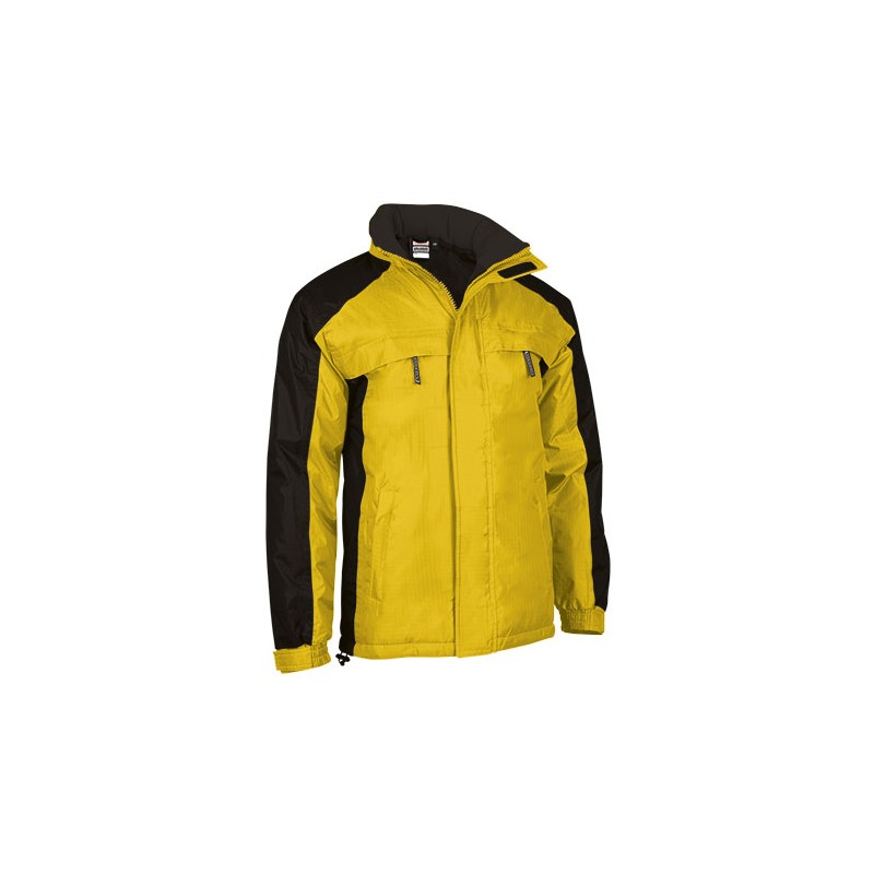 Chaquetón de abrigo en colores combinados, confeccionado en tejido técnico exterior Ripstop, recubierto de PVC con tratamiento impermeable, relleno acolchado y forro liso interior. Incluye tejido polar en cuello y bolsillos. Cuello alto y cierre con cremallera frontal. Cordón regulador interior (cordón solo en las tallas de adulto) y puños con elástico y velcro. Capucha con cordón oculta en el cuello. Dos bolsillos bajos con cremallera y dos bolsillos en pecho con cremallera. Dos bolsillos interiores. Costuras termoselladas que impiden el paso del agua. Cremallera interior para facilitar el marcaje. Bandas en color a contraste en hombros, mangas y costados.