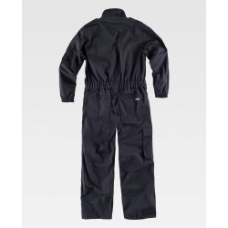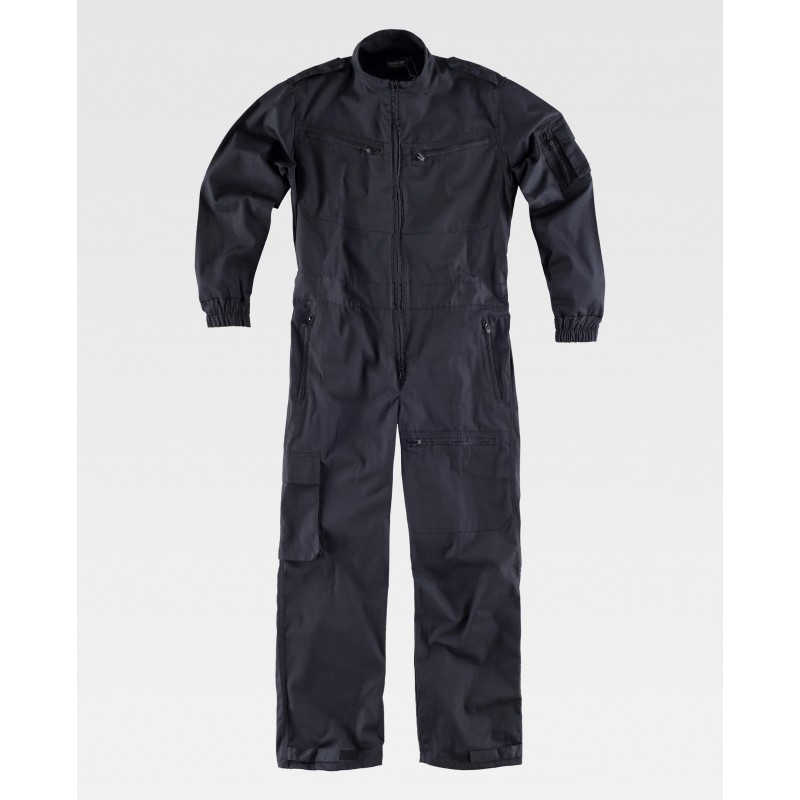 Buzo de cuello alto y cierre de cremallera de nylon de doble tirador. Galonera con velcro en hombros. Dos bolsos de pecho de plastón con cremallera. Un bolso en manga de plastón con cremallera y otro sobrepuesto con fuelle y cartera de velcro. Dos bolsos con abertura inclinada en los costados con cremallera. Un bolso lateral de carga con cartera de velcro y otro interior con cremallera. Dos bolsos traseros de plastón con cremallera. Bajos ajustables con velcro. Puño con elástico. Cinturilla con elástico en la espalda.