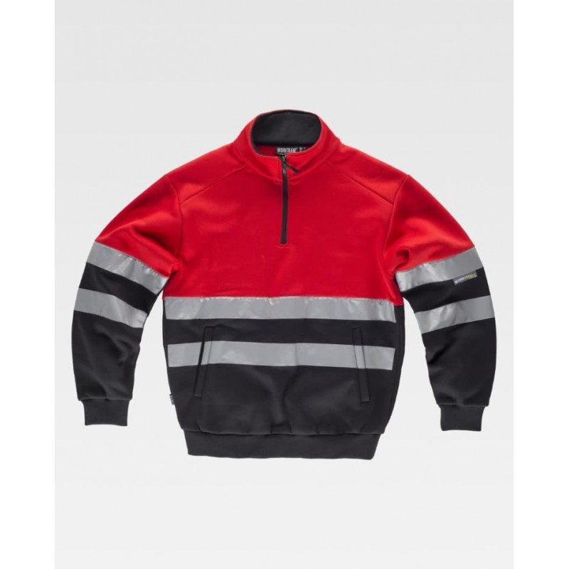Sudadera combinada con cintas reflectantes. Cuello alto con cierre de media cremallera de nylon y costuras reforzadas. Dos bolsos laterales interiores. Dos cintas reflectantes en pecho, espalda y mangas. Suave y cálido acabado en el interior. Puños y cintura elásticos en punto canalé.