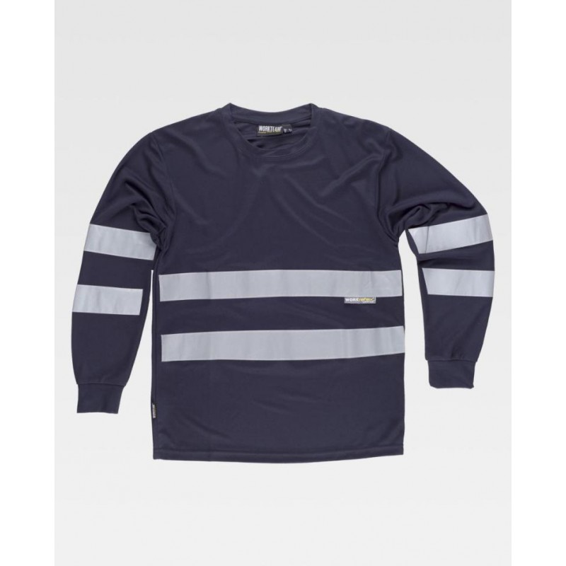 Camiseta de manga larga en poliéster ojo de perdiz con cintas reflectantes. Cuello redondo con cubrecosturas interior. Dos cintas reflectantes en pecho, espalda y mangas. Puño elástico. Tejido fresco y ligero de alta permeabilidad al aire. Transpirable, de fácil secado y resistente al encogimiento.